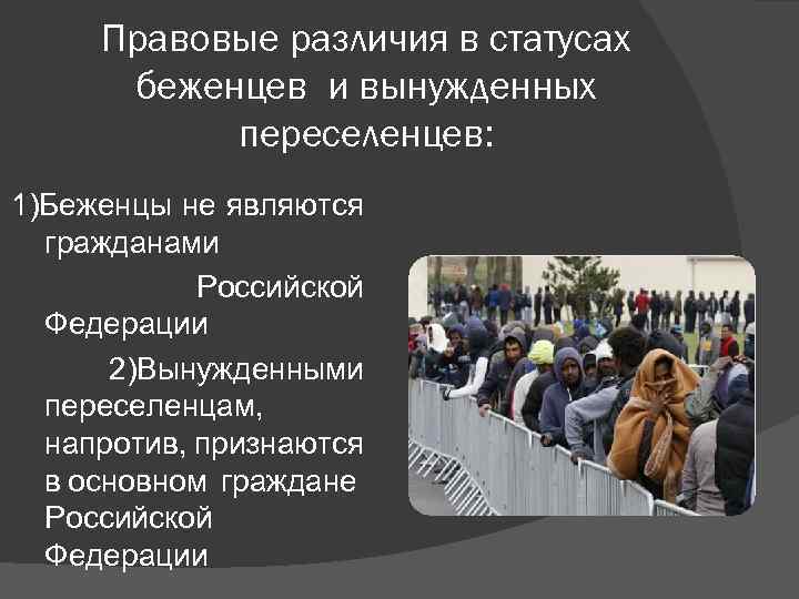 Правовые различия в статусах беженцев и вынужденных переселенцев: 1)Беженцы не являются гражданами Российской Федерации 2)Вынужденными переселенцам, напротив, признаются в основном граждане Российской Федерации