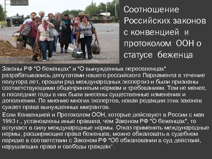 Соотношение Российских законов с конвенцией и протоколом ООН о статусе беженца Законы РФ "О беженцах" и "О вынужденных переселенцах" разрабатывались депутатами нашего российского Парламента в течение полутора лет, прошли ряд международных экспертиз и были признаны соответствующими общепринятым нормам и требованиям. Тем не менее, в последние годы в них были внесены существенные изменения и дополнения. По мнению многих экспертов, новая редакция этих законов сужает права вынужденных мигрантов. Если Конвенцией и Протоколом ООН, которые действуют в России с мая 1993 г. , установлены иные правила, чем Законом РФ "О беженцах", то вступают в силу международные нормы. Отказ применять международные нормы, расширяющие права беженцев, можно обжаловать в судебном порядке в соответствии с Законом РФ "Об обжаловании в суд действий, нарушающих права и свободы граждан".