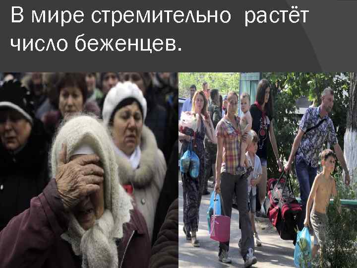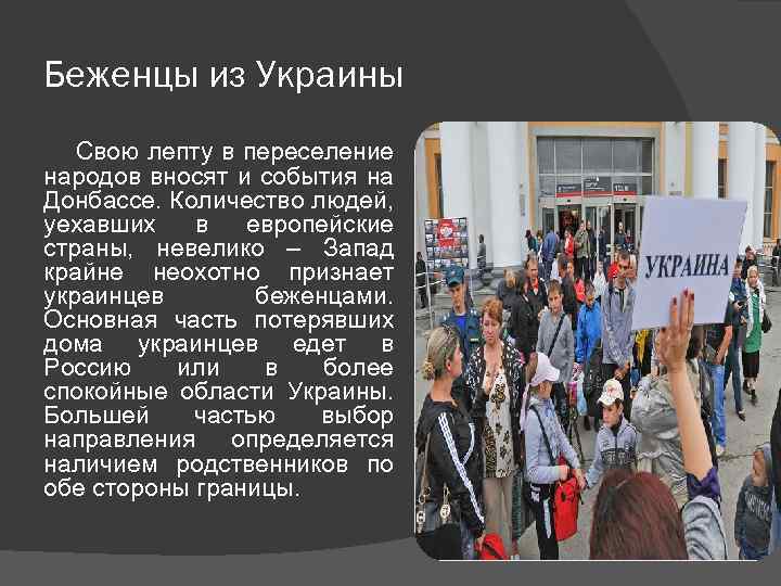 Беженцы из Украины Свою лепту в переселение народов вносят и события на Донбассе. Количество людей, уехавших в европейские страны, невелико – Запад крайне неохотно признает украинцев беженцами. Основная часть потерявших дома украинцев едет в Россию или в более спокойные области Украины. Большей частью выбор направления определяется наличием родственников по обе стороны границы.