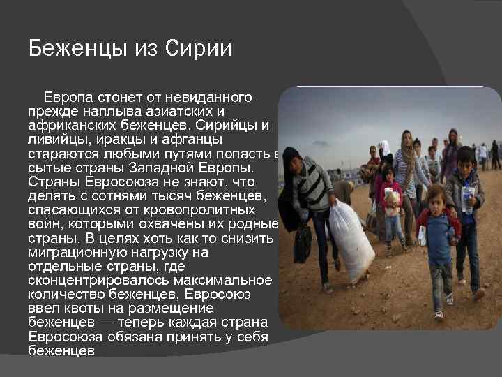 Беженцы из Сирии Европа стонет от невиданного прежде наплыва азиатских и африканских беженцев. Сирийцы и ливийцы, иракцы и афганцы стараются любыми путями попасть в сытые страны Западной Европы. Страны Евросоюза не знают, что делать с сотнями тысяч беженцев, спасающихся от кровопролитных войн, которыми охвачены их родные страны. В целях хоть как то снизить миграционную нагрузку на отдельные страны, где сконцентрировалось максимальное количество беженцев, Евросоюз ввел квоты на размещение беженцев — теперь каждая страна Евросоюза обязана принять у себя беженцев