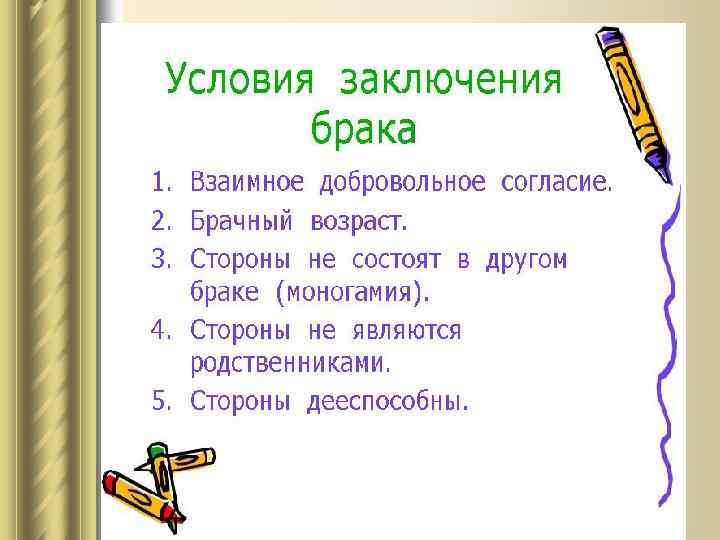 Условия, препятствующие заключению брака 1. Близкие родственные связи. 2. Отношения усыновления. 3. Наличие других браков.