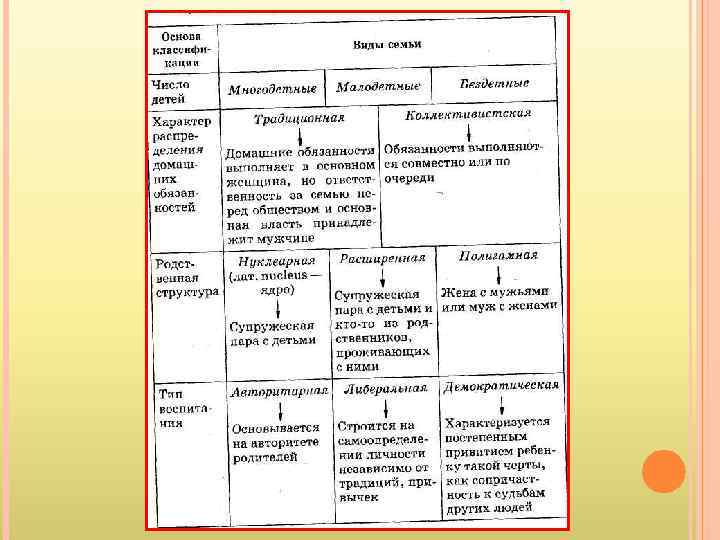 Репродуктивная Биологическое воспроизводство населения — на общественном уровне и удовлетворение потребности в детях — на личностном уровне Социализации Формирование индивида как личности Хозяйственно-бытовая Ведение домашнего хозяйства, уход за детьми и престарелыми членами семьи Экономическая Материальная поддержка несовершеннолетних и нетрудоспособных членов семьи Социально-статусная Предоставление определенного социального статуса членам семьи (наделение наследственными статусами — национальность, религия и др. ), воспроизводство социальной структуры общества Эмоциональная Оказание психологической поддержки членам семьи Защитная Физическая, экономическая, психологическая защита членов семьи Духовно-нравственная Развитие личности каждого члена семьи Досуговая Организация рационального досуга, взаимообогащение интересов членов семьи