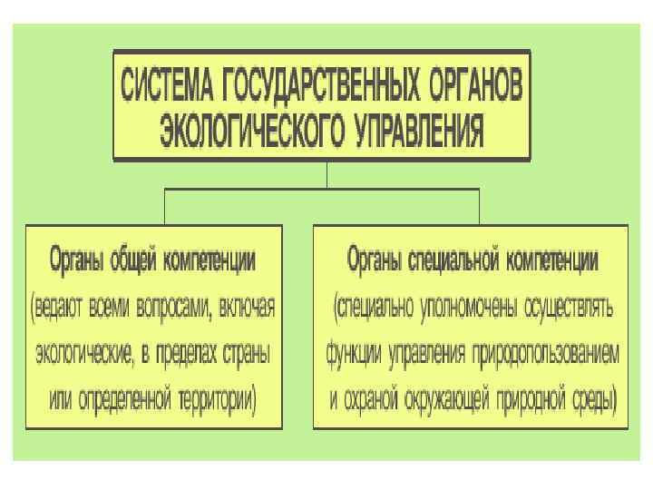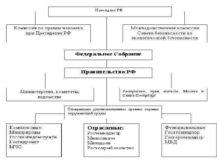 Органы, осуществляющие управление охраной окружающей природной среды в России • На федеральном уровне: ü Федеральное Собрание; ü Президент РФ; ü Правительство РФ ü Специально уполномоченные органы: - Министерство природных ресурсов и экологии РФ - Федеральная служба по гидрометеорологии и мониторингу окружающей среды; - Федеральная служба по надзору в сфере природопользования; - Федеральное агентство водных ресурсов; - Федеральное агентство лесного хозяйства; - Федеральное агентство по недропользованию - Государственный комитет РФ по охране среды. • На региональном уровне : ü Представительные и исполнительные органы власти; • • Местные органы самоуправления Территориальные органы указанных выше специально уполномоченных ведомств.