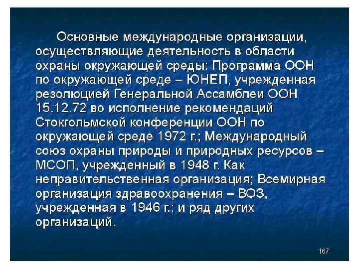 1. Особенности правового регулирования природопользования и охраны окружающей среды • для защиты среды обитания природоохранное законодательство Ø раздел международного права Ø раздел правовой охраны природы внутри государства, содержащий юридические основы сохранения природных ресурсов и среды существования жизни.