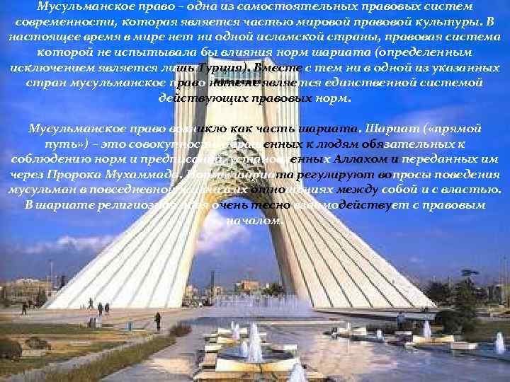 Мусульманское право – одна из самостоятельных правовых систем современности, которая является частью мировой правовой культуры. В настоящее время в мире нет ни одной исламской страны, правовая система которой не испытывала бы влияния норм шариата (определенным исключением является лишь Турция). Вместе с тем ни в одной из указанных стран мусульманское право ныне не является единственной системой действующих правовых норм. Мусульманское право возникло как часть шариата. Шариат ( «прямой путь» ) – это совокупность обращенных к людям обязательных к соблюдению норм и предписаний, установленных Аллахом и переданных им через Пророка Мухаммада. Нормы шариата регулируют вопросы поведения мусульман в повседневной жизни в их отношениях между собой и с властью. В шариате религиозная идея очень тесно взаимодействует с правовым началом.