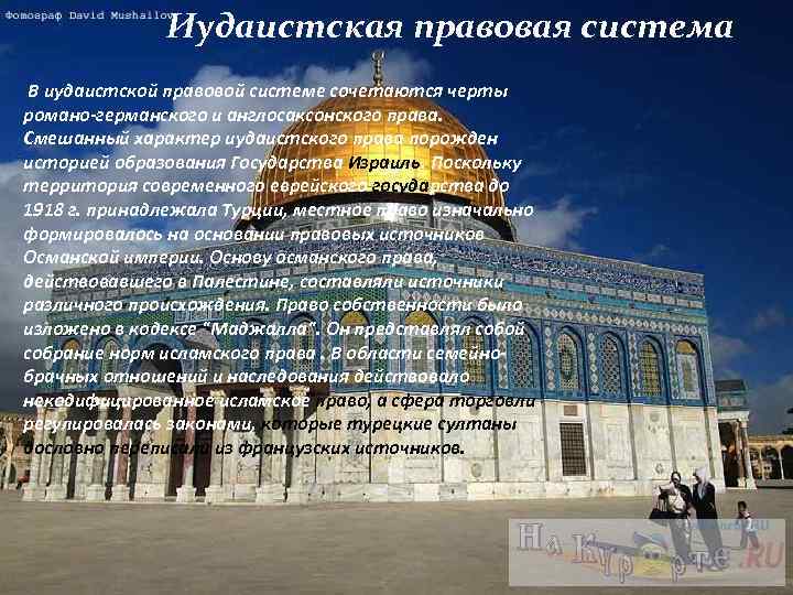 Иудаистская правовая система В иудаистской правовой системе сочетаются черты романо-германского и англосаксонского права. Смешанный характер иудаистского права порожден историей образования Государства Израиль. Поскольку территория современного еврейского государства до 1918 г. принадлежала Турции, местное право изначально формировалось на основании правовых источников Османской империи. Основу османского права, действовавшего в Палестине, составляли источники различного происхождения. Право собственности было изложено в кодексе "Маджалла". Он представлял собой собрание норм исламского права. В области семейнобрачных отношений и наследования действовало некодифицированное исламское право, а сфера торговли регулировалась законами, которые турецкие султаны дословно переписали из французских источников.