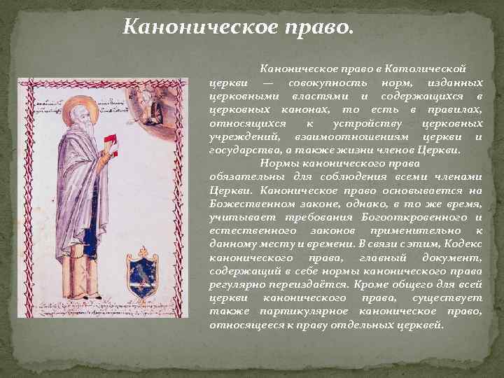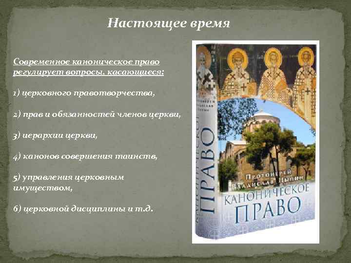 Настоящее время Современное каноническое право регулирует вопросы, касающиеся: 1) церковного правотворчества, 2) прав и обязанностей членов церкви, 3) иерархии церкви, 4) канонов совершения таинств, 5) управления церковным имуществом, 6) церковной дисциплины и т. д.