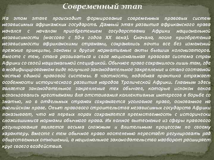 Современный этап На этом этапе происходит формирование современных правовых систем независимых африканских государств. Данный этап развития африканского права начался с началом приобретением государствами Африки национальной независимости (массово с 50 -х годов XX века). Сначала, после приобретения независимости африканскими странами, сохранялись почти все без изменений прежние принципы, законы и другие нормативные акты бывших колонизаторов. Вместе с тем, стала развиваться и своя национальная правовая система стран Африки со своей национальной спецификой. Обычное право сохранилось лишь там, где в модифицированном виде получило законодательное закрепление и стало составной частью единой правовой системы. В частности, подобная практика отражает особенности исторического развития народов Тропической Африки. Главным здесь является законодательное закрепление тех обычаев, которые испокон веков использовались крестьянами для отстаивания коллективных интересов в борьбе со знатью, но в отдельных странах сохраняется уголовное право, основанное на английском праве. Опыт правового строительства независимых государств Африки показывает, что на первых порах сохраняется преемственность с исторически сложившимися нормами обычного права. Их полное вытеснение из сферы правового регулирования является весьма сложным и длительным процессом по своему характеру. Вместе с тем обычное право постепенно перестаёт регулировать ряд общественных отношений, а национальное законодательство наоборот расширяет круг своего воздействия.