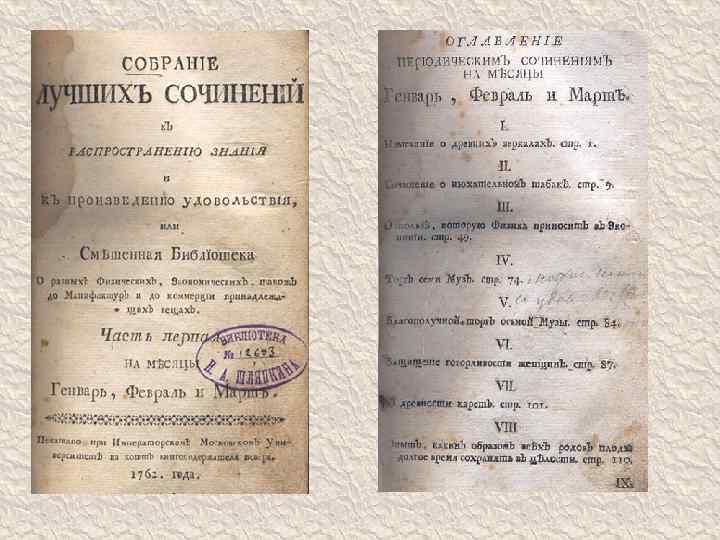В 1760 -е при Московском университете • • • «Полезное увеселение» , «Свободные часы» , «Невинное упражнение» , «Доброе намерение» , «Собрание лучших сочинений» .