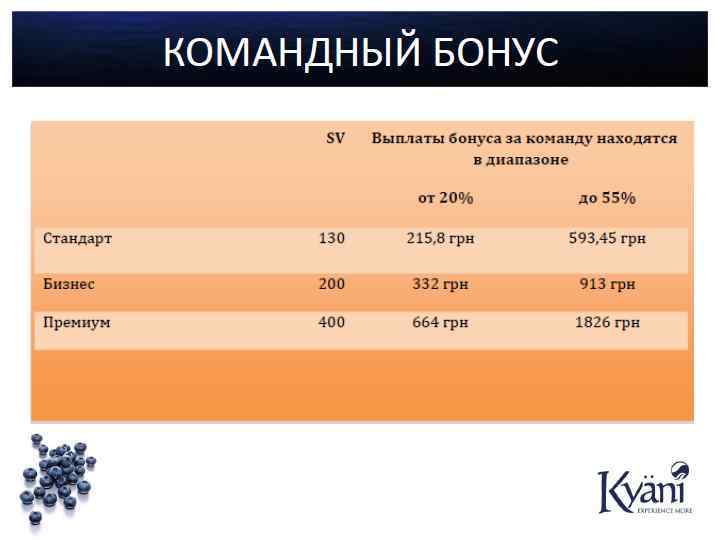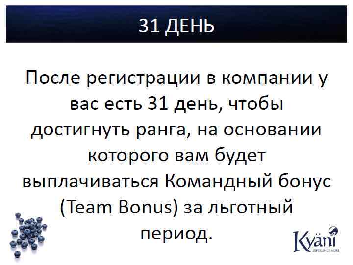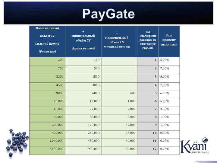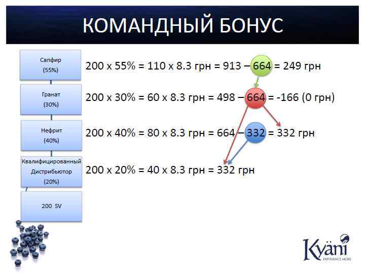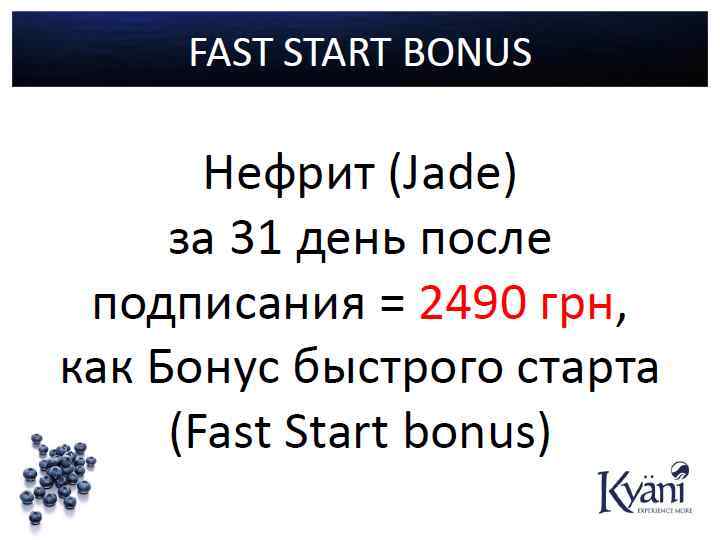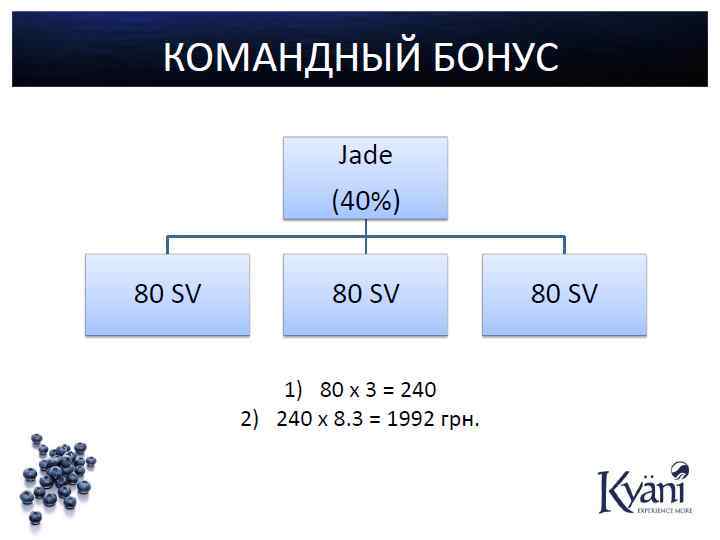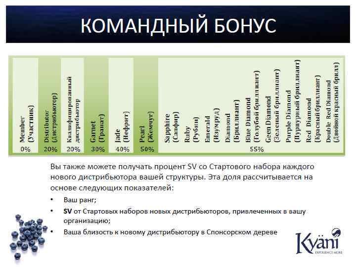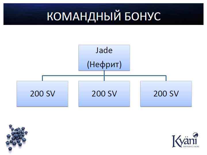 Pre LAUNCH GERMANY 2012 Нефрит2 000 QV Маркетинг план 400 QV 200 SV Доход за 1 -й месяц: Командный бонус ( 40$ + 60$ + 20$ ): 180$ Быстрый старт Бонус: 300$ Pay. Gate Bonus: 98$ Всего: 578$ Ранг Статус 1 2 400 QV 20%-Командный бонус за 200 SV = 40$ 400 QV 30%-командный бонус за 200 SV = 60$ Дистр ибутор Гран ат Неф рит Жем чуг Сапф ир Рубин Изу мруд 300 2 000 5 000 10 000 25 000 50 000 100 000 Сильная струк-ра 60% / 200 1 200 3 000 6 000 15 000 30 000 60 000 Вторая струк-ра 35% / 100 800 2 000 3 500 8 750 17 500 35 000 Третья струк-ра 5% / / 500 1 250 2 500 5 000 Team Bonus SV 20% 30% 40% 55% 55% 55% 400 QV 30%-Командный бонус за 200 SV = 60$ Брилл иант / 3 Квалиф-ция статуса QV 400 QV 10%-Командный онус за 200 SV = 20$