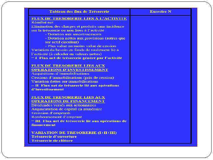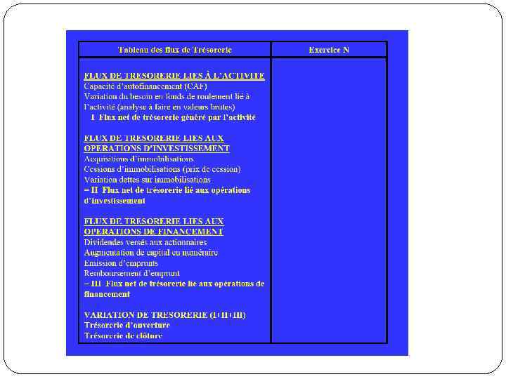 Le tableau des flux de tresorerie Le tableau des flux de trésorerie analyse la variation de la trésorerie selon 3 catégories distinctes : Flux liés à l’activité, Flux liés à l’investissement, Flux liés au financement, En pied de tableau cette variation sera justifiée par la différence entre la trésorerie de clôture de l’exercice et celle de l’ouverture de l’exercice.
