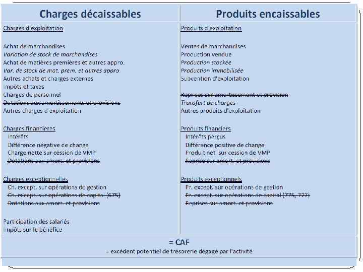 CAF = produits encaissables - charges décaissables ELEMENTS EXCLUS: Les charges non décaissables(ou charges calculées) sont: - Les dotations aux amortissements; - Les dotations aux provisions; - La valeur comptable des éléments d’actif cédés;
