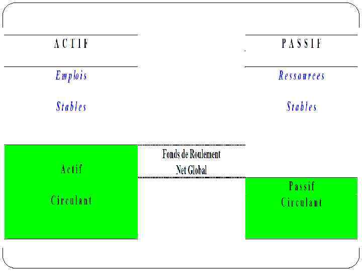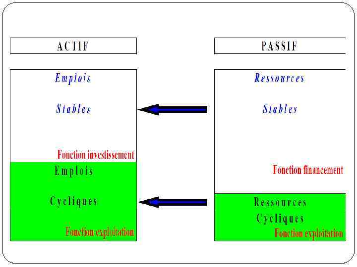 A l’actif : EMPLOIS STABLES : - actif immobilisé ACTIF CIRCULANT : - stocks - créances - trésorerie positive