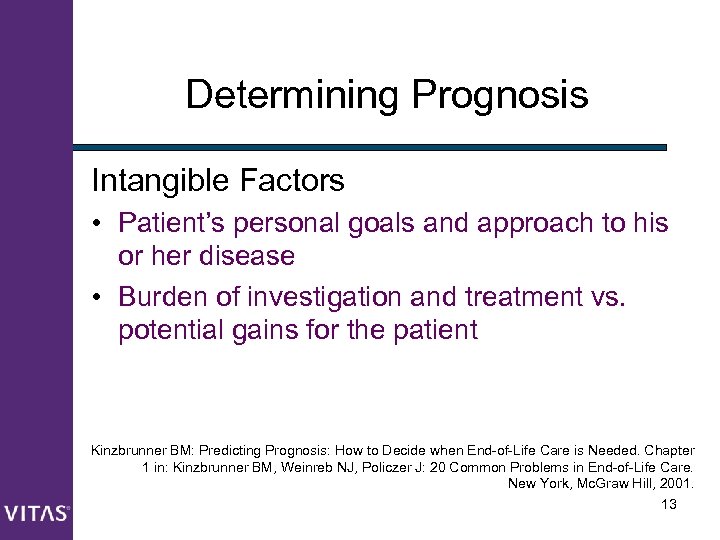 Determining Prognosis Unintentional Weight Loss • > 10% of normal body weight • Body Mass Index (BMI) < 22 kg/m 2 Of Note: For ongoing determination of wasting, documentation of Mid-arm Muscle (MMA) is a significant indicator of decline Kinzbrunner BM: Predicting Prognosis: How to Decide when End-of-Life Care is Needed. Chapter 1 in: Kinzbrunner BM, Weinreb NJ, Policzer J: 20 Common Problems in End-of-Life Care. 12 New York, Mc. Graw Hill, 2001.