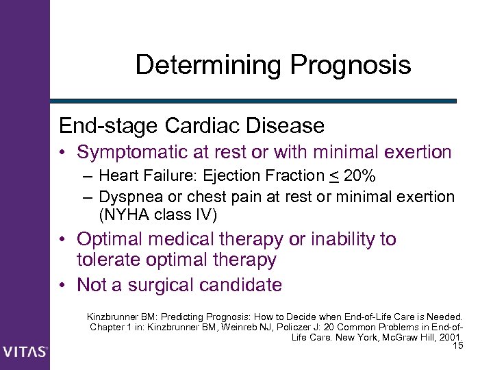 Determining Prognosis Cancer Diagnoses • Stage IV — presence of metastases • Natural history of disease • Sensitivity of the disease to anti-neoplastic therapy • Prior treatment history where indicated Kinzbrunner BM: Predicting Prognosis: How to Decide when End-of-Life Care is Needed. Chapter 1 in: Kinzbrunner BM, Weinreb NJ, Policzer J: 20 Common Problems in End-of-Life Care. New York, Mc. Graw Hill, 2001. 14