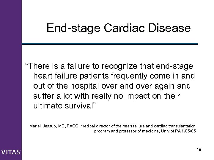 End-stage Cardiac Disease “There is a failure to recognize that end-stage heart failure patients frequently come in and out of the hospital over and over again and suffer a lot with really no impact on their ultimate survival” Mariell Jessup, MD, FACC, medical director of the heart failure and cardiac transplantation program and professor of medicine, Univ of PA 9/05/05 18