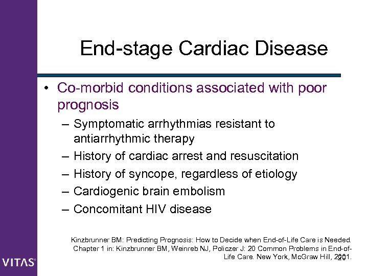 End-stage Cardiac Disease • Co-morbid conditions associated with poor prognosis – Symptomatic arrhythmias resistant to antiarrhythmic therapy – History of cardiac arrest and resuscitation – History of syncope, regardless of etiology – Cardiogenic brain embolism – Concomitant HIV disease Kinzbrunner BM: Predicting Prognosis: How to Decide when End-of-Life Care is Needed. Chapter 1 in: Kinzbrunner BM, Weinreb NJ, Policzer J: 20 Common Problems in End-of. Life Care. New York, Mc. Graw Hill, 2001. 20