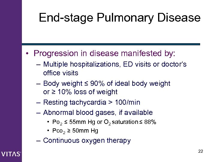 End-stage Pulmonary Disease • In advanced disease the clinical course of patients usually consists of periods of relatively stable disease punctuated by episodic acute decompensation • In disease progression: – Acute episodes become more frequent – Periods of stability become the exception rather than the rule 21