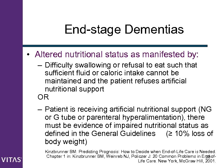 End-stage Dementias • Altered nutritional status as manifested by: – Difficulty swallowing or refusal to eat such that sufficient fluid or caloric intake cannot be maintained and the patient refuses artificial nutritional support OR – Patient is receiving artificial nutritional support (NG or G tube or parenteral hyperalimentation), there must be evidence of impaired nutritional status as defined in the General Guidelines (≥ 10% loss of body weight) Kinzbrunner BM: Predicting Prognosis: How to Decide when End-of-Life Care is Needed. Chapter 1 in: Kinzbrunner BM, Weinreb NJ, Policzer J: 20 Common Problems in End-of 25 Life Care. New York, Mc. Graw Hill, 2001.