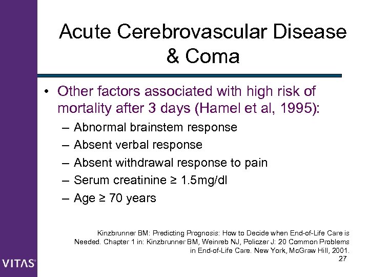 Acute Cerebrovascular Disease & Coma • Other factors associated with high risk of mortality after 3 days (Hamel et al, 1995): – – – Abnormal brainstem response Absent verbal response Absent withdrawal response to pain Serum creatinine ≥ 1. 5 mg/dl Age ≥ 70 years Kinzbrunner BM: Predicting Prognosis: How to Decide when End-of-Life Care is Needed. Chapter 1 in: Kinzbrunner BM, Weinreb NJ, Policzer J: 20 Common Problems in End-of-Life Care. New York, Mc. Graw Hill, 2001. 27