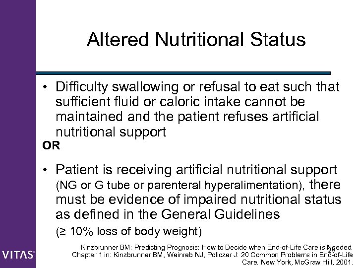 Altered Nutritional Status • Difficulty swallowing or refusal to eat such that sufficient fluid or caloric intake cannot be maintained and the patient refuses artificial nutritional support OR • Patient is receiving artificial nutritional support (NG or G tube or parenteral hyperalimentation), there must be evidence of impaired nutritional status as defined in the General Guidelines (≥ 10% loss of body weight) Kinzbrunner BM: Predicting Prognosis: How to Decide when End-of-Life Care is Needed. 29 Chapter 1 in: Kinzbrunner BM, Weinreb NJ, Policzer J: 20 Common Problems in End-of-Life Care. New York, Mc. Graw Hill, 2001.