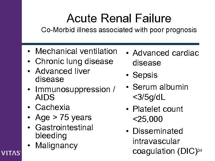 Acute Renal Failure Co-Morbid illness associated with poor prognosis • Mechanical ventilation • Advanced cardiac • Chronic lung disease • Advanced liver • Sepsis disease • Immunosuppression / • Serum albumin <3/5 g/d. L AIDS • Cachexia • Platelet count • Age > 75 years <25, 000 • Gastrointestinal • Disseminated bleeding intravascular • Malignancy coagulation (DIC)34