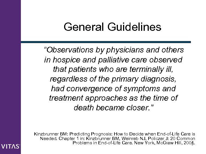 General Guidelines “Observations by physicians and others in hospice and palliative care observed that patients who are terminally ill, regardless of the primary diagnosis, had convergence of symptoms and treatment approaches as the time of death became closer. ” Kinzbrunner BM: Predicting Prognosis: How to Decide when End-of-Life Care is Needed. Chapter 1 in: Kinzbrunner BM, Weinreb NJ, Policzer J: 20 Common Problems in End-of-Life Care. New York, Mc. Graw Hill, 2001. 5