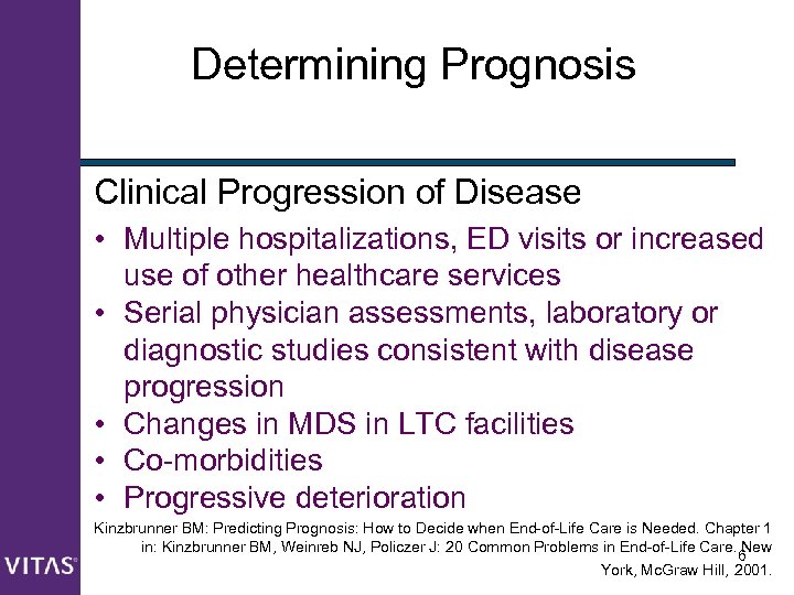 Determining Prognosis Changes in Functional Status • Cancer Patients – PPS < 50 or ECOG > 3 – PPS < 60 or ECOG > 2 with symptoms – Decline in PPS of at least 20 units in 2 -3 months • Non-Cancer Patients – Dependence in at least 3/6 Activities of Daily Living – PPS < 50 Kinzbrunner BM: Predicting Prognosis: How to Decide when End-of-Life Care is Needed. Chapter 1 in: Kinzbrunner BM, Weinreb NJ, Policzer J: 20 Common Problems in End-of 7 Life Care. New York, Mc. Graw Hill, 2001.