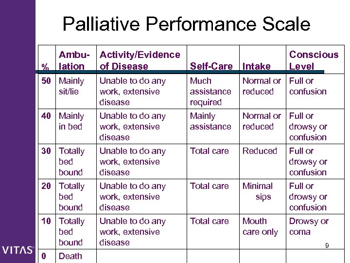 Palliative Performance Scale Ambu% lation Activity/Evidence of Disease Self-Care Intake 50 Mainly sit/lie Unable to do any work, extensive disease Much assistance required Normal or Full or reduced confusion 40 Mainly in bed Unable to do any work, extensive disease Mainly assistance Normal or Full or reduced drowsy or confusion 30 Totally bed bound Unable to do any work, extensive disease Total care Reduced Full or drowsy or confusion 20 Totally bed bound Unable to do any work, extensive disease Total care Minimal sips Full or drowsy or confusion 10 Totally bed bound Unable to do any work, extensive disease Total care Mouth care only Drowsy or coma 0 Death Conscious Level 9