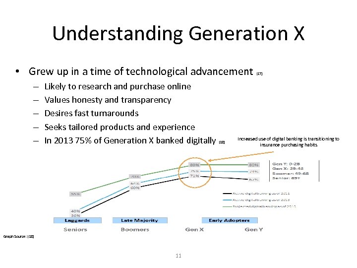 Understanding Generation X • Grew up in a time of technological advancement – – – Likely to research and purchase online Values honesty and transparency Desires fast turnarounds Seeks tailored products and experience In 2013 75% of Generation X banked digitally [18] Graph Source: [18] 11 [17] Increased use of digital banking is transitioning to insurance purchasing habits