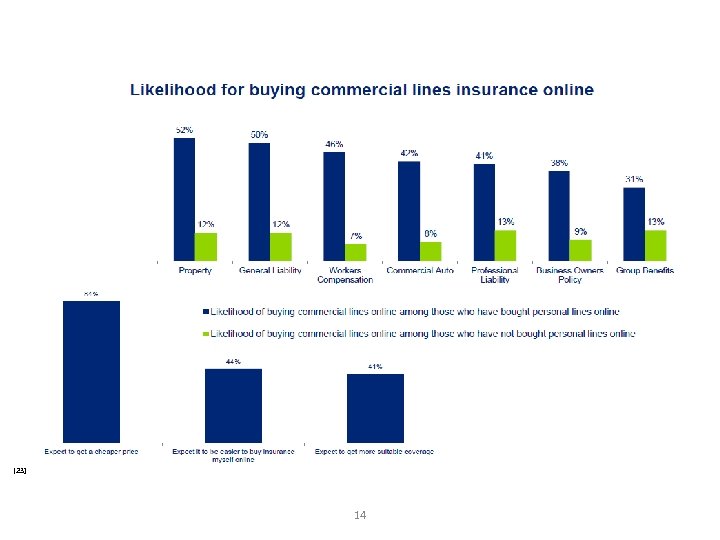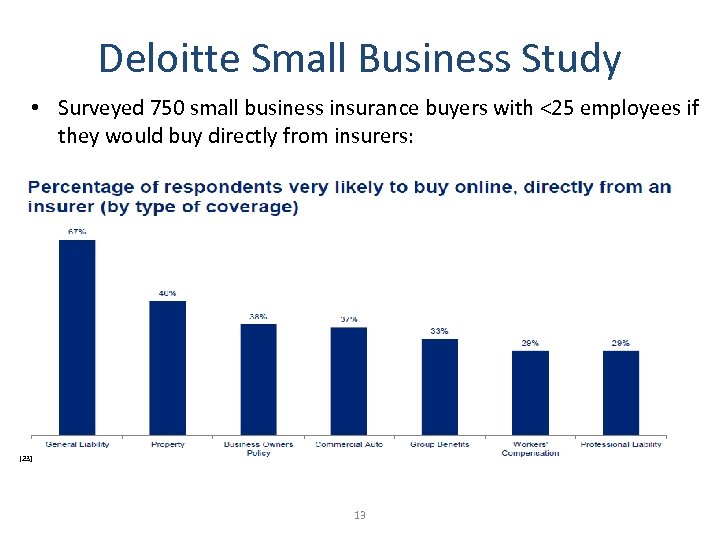 Deloitte Study on small business owners Deloitte Small Business Study • Surveyed 750 small business insurance buyers with <25 employees if they would buy directly from insurers: [23] 13