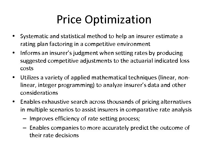 Price Optimization • Systematic and statistical method to help an insurer estimate a rating plan factoring in a competitive environment • Informs an insurer’s judgment when setting rates by producing suggested competitive adjustments to the actuarial indicated loss costs • Utilizes a variety of applied mathematical techniques (linear, nonlinear, integer programming) to analyze insurer’s data and other considerations • Enables exhaustive search across thousands of pricing alternatives in multiple scenarios to assist insurers in comparative rate analysis – Improves efficiency of rate setting process; – Enables companies to more accurately predict the outcome of their rate decisions