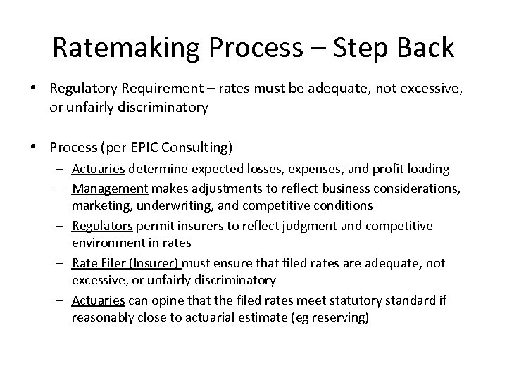 Ratemaking Process – Step Back • Regulatory Requirement – rates must be adequate, not excessive, or unfairly discriminatory • Process (per EPIC Consulting) – Actuaries determine expected losses, expenses, and profit loading – Management makes adjustments to reflect business considerations, marketing, underwriting, and competitive conditions – Regulators permit insurers to reflect judgment and competitive environment in rates – Rate Filer (Insurer) must ensure that filed rates are adequate, not excessive, or unfairly discriminatory – Actuaries can opine that the filed rates meet statutory standard if reasonably close to actuarial estimate (eg reserving)