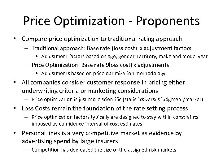 Price Optimization - Proponents • Compare price optimization to traditional rating approach – Traditional approach: Base rate (loss cost) x adjustment factors • Adjustment factors based on age, gender, territory, make and model year – Price Optimization: Base rate 9 loss cost) x adjustments • Adjustments based on price optimization methodology • All companies consider customer response in pricing either underwriting criteria or marketing considerations – Price optimization is just more scientific (statistics versus judgment/market) • Loss Costs remain the foundation of the rate setting process – Price optimization factors typically are designed to stay within constraints imposed by confidence interval of cost estimates • Personal lines is a very competitive market as evidence by advertising spend by large insurers – Competition has decreased the size of the assigned risk markets