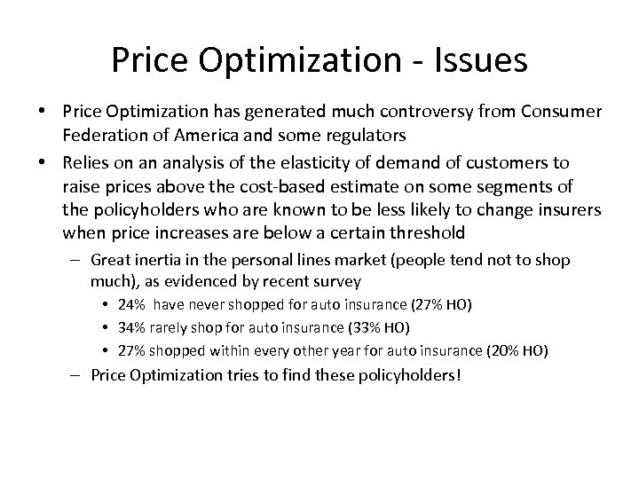Price Optimization - Issues • Price Optimization has generated much controversy from Consumer Federation of America and some regulators • Relies on an analysis of the elasticity of demand of customers to raise prices above the cost-based estimate on some segments of the policyholders who are known to be less likely to change insurers when price increases are below a certain threshold – Great inertia in the personal lines market (people tend not to shop much), as evidenced by recent survey • 24% have never shopped for auto insurance (27% HO) • 34% rarely shop for auto insurance (33% HO) • 27% shopped within every other year for auto insurance (20% HO) – Price Optimization tries to find these policyholders!