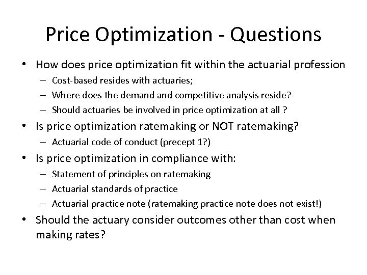 Price Optimization - Questions • How does price optimization fit within the actuarial profession – Cost-based resides with actuaries; – Where does the demand competitive analysis reside? – Should actuaries be involved in price optimization at all ? • Is price optimization ratemaking or NOT ratemaking? – Actuarial code of conduct (precept 1? ) • Is price optimization in compliance with: – Statement of principles on ratemaking – Actuarial standards of practice – Actuarial practice note (ratemaking practice note does not exist!) • Should the actuary consider outcomes other than cost when making rates?