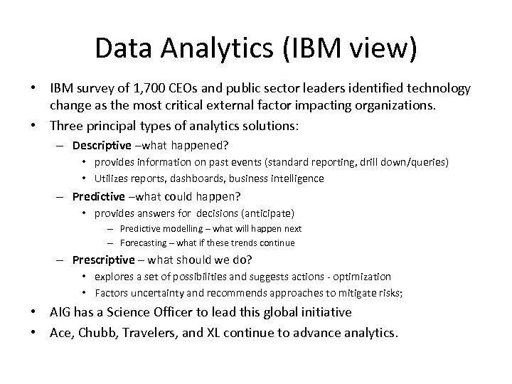 Data Analytics (IBM view) • IBM survey of 1, 700 CEOs and public sector leaders identified technology change as the most critical external factor impacting organizations. • Three principal types of analytics solutions: – Descriptive –what happened? • provides information on past events (standard reporting, drill down/queries) • Utilizes reports, dashboards, business intelligence – Predictive –what could happen? • provides answers for decisions (anticipate) – Predictive modelling – what will happen next – Forecasting – what if these trends continue – Prescriptive – what should we do? • explores a set of possibilities and suggests actions - optimization • Factors uncertainty and recommends approaches to mitigate risks; • AIG has a Science Officer to lead this global initiative • Ace, Chubb, Travelers, and XL continue to advance analytics.