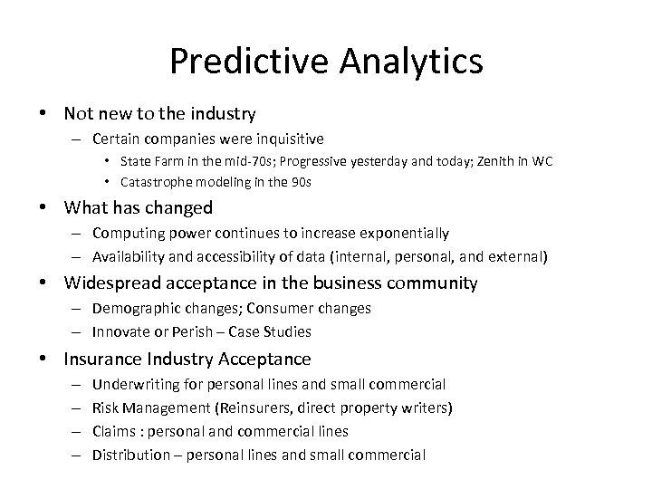 Predictive Analytics • Not new to the industry – Certain companies were inquisitive • State Farm in the mid-70 s; Progressive yesterday and today; Zenith in WC • Catastrophe modeling in the 90 s • What has changed – Computing power continues to increase exponentially – Availability and accessibility of data (internal, personal, and external) • Widespread acceptance in the business community – Demographic changes; Consumer changes – Innovate or Perish – Case Studies • Insurance Industry Acceptance – – Underwriting for personal lines and small commercial Risk Management (Reinsurers, direct property writers) Claims : personal and commercial lines Distribution – personal lines and small commercial