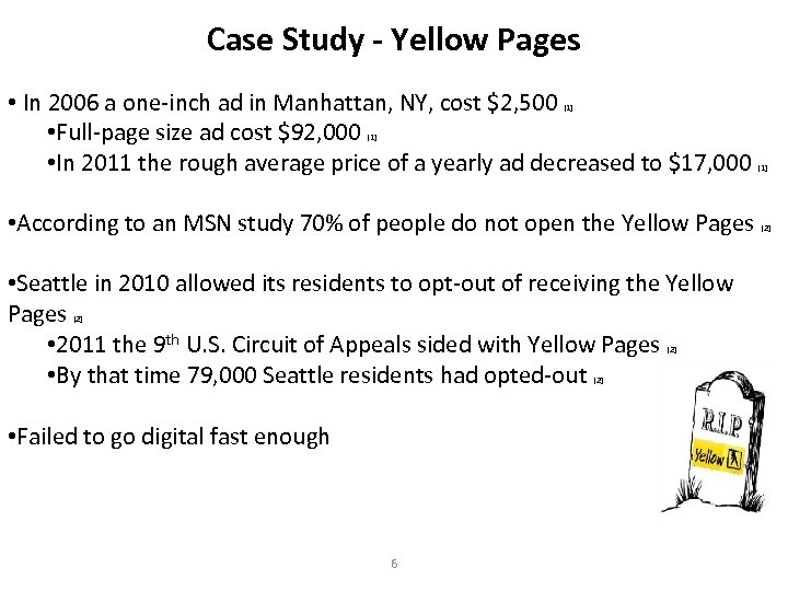 Case Study - Yellow Pages • In 2006 a one-inch ad in Manhattan, NY, cost $2, 500 • Full-page size ad cost $92, 000 • In 2011 the rough average price of a yearly ad decreased to $17, 000 [1] • According to an MSN study 70% of people do not open the Yellow Pages • Seattle in 2010 allowed its residents to opt-out of receiving the Yellow Pages • 2011 the 9 th U. S. Circuit of Appeals sided with Yellow Pages • By that time 79, 000 Seattle residents had opted-out [2] [2] • Failed to go digital fast enough 6 [1] [2]