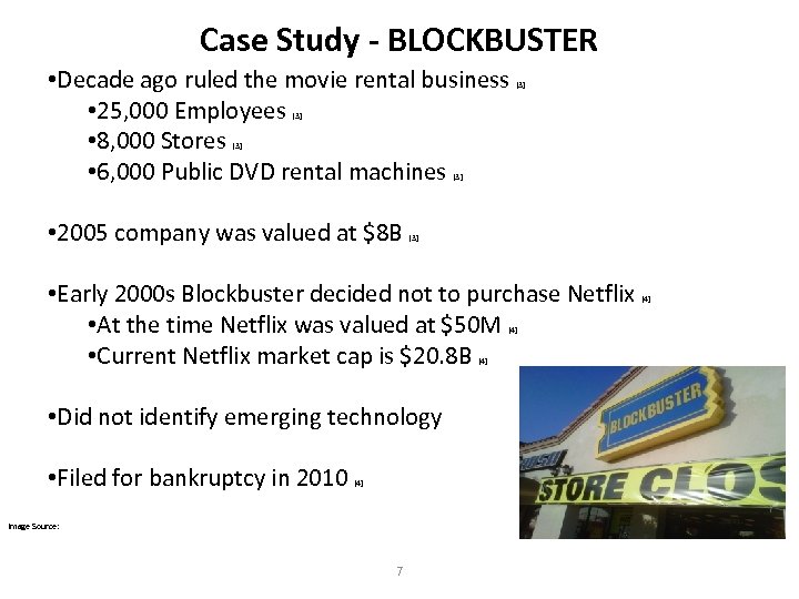 Case Study - BLOCKBUSTER • Decade ago ruled the movie rental business • 25, 000 Employees • 8, 000 Stores • 6, 000 Public DVD rental machines [3] [3] • 2005 company was valued at $8 B [3] • Early 2000 s Blockbuster decided not to purchase Netflix • At the time Netflix was valued at $50 M • Current Netflix market cap is $20. 8 B [4] • Did not identify emerging technology • Filed for bankruptcy in 2010 [4] Image Source: 7 [4]