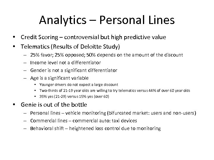 Analytics – Personal Lines • Credit Scoring – controversial but high predictive value • Telematics (Results of Deloitte Study) – – 25% favor; 25% opposed; 50% depends on the amount of the discount Income level not a differentiator Gender is not a significant differentiator Age is a significant variable • Younger drivers do not expect a large discount • Two-thirds of 21 -19 year olds are willing to try telematics versus 44% of over 60 year olds • 35% yes (21 -29) versus 15% yes (over 60) • Genie is out of the bottle – Personal lines – vehicle monitoring (bifurcated market: users and non-users) – Commercial lines – commercial auto: taxi devices – Behavioral shift – heightened loss control due to monitoring