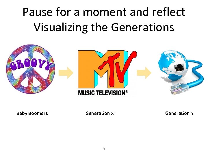 Pause for a moment and reflect Visualizing the Generations Baby Boomers Generation X 9 Generation Y