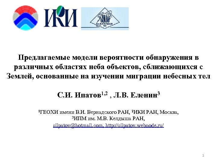 Предлагаемые модели вероятности обнаружения в различных областях неба объектов, сближающихся с Землей, основанные на изучении миграции небесных тел С. И. Ипатов 1, 2 , Л. В. Еленин 3 1 ГЕОХИ имени В. И. Вернадского РАН, 2 ИКИ РАН, Москва, 3 ИПМ им. М. В. Келдыша РАН, siipatov@hotmail. com, http: //siipatov. webnode. ru/ 1
