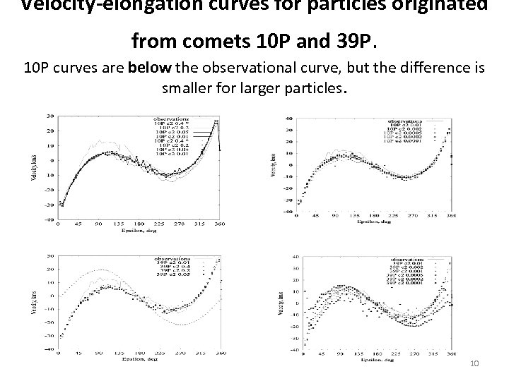 Velocity-elongation curves for particles originated from comets 10 P and 39 P. 10 P curves are below the observational curve, but the difference is smaller for larger particles. 10