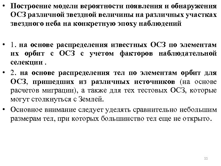 • Построение модели вероятности появления и обнаружения ОСЗ различной звездной величины на различных участках звездного неба на конкретную эпоху наблюдений • 1. на основе распределения известных ОСЗ по элементам их орбит с ОСЗ с учетом факторов наблюдательной селекции. • 2. на основе распределения тел по элементам орбит для ОСЗ, пришедших из различных источников (на основе расчетов миграции), а также для тех тестовых ОСЗ, которые могут столкнуться с Землей. • Основное внимание следует уделять сравнительно небольшим размерам тел, при которых большинство тел еще не открыто. 11