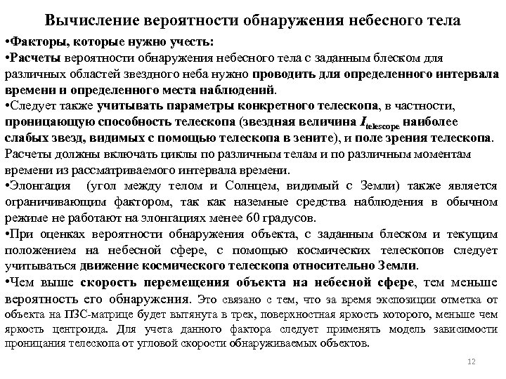 Вычисление вероятности обнаружения небесного тела • Факторы, которые нужно учесть: • Расчеты вероятности обнаружения небесного тела с заданным блеском для различных областей звездного неба нужно проводить для определенного интервала времени и определенного места наблюдений. • Следует также учитывать параметры конкретного телескопа, в частности, проницающую способность телескопа (звездная величина Itelescope наиболее слабых звезд, видимых с помощью телескопа в зените), и поле зрения телескопа. Расчеты должны включать циклы по различным телам и по различным моментам времени из рассматриваемого интервала времени. • Элонгация (угол между телом и Солнцем, видимый с Земли) также является ограничивающим фактором, так как наземные средства наблюдения в обычном режиме не работают на элонгациях менее 60 градусов. • При оценках вероятности обнаружения объекта, с заданным блеском и текущим положением на небесной сфере, с помощью космических телескопов следует учитываться движение космического телескопа относительно Земли. • Чем выше скорость перемещения объекта на небесной сфере, тем меньше вероятность его обнаружения. Это связано с тем, что за время экспозиции отметка от объекта на ПЗС-матрице будет вытянута в трек, поверхностная яркость которого, меньше чем яркость центроида. Для учета данного фактора следует применять модель зависимости проницания телескопа от угловой скорости обнаруживаемых объектов. 12