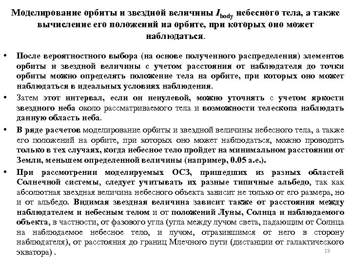 Моделирование орбиты и звездной величины Ibody небесного тела, а также вычисление его положений на орбите, при которых оно может наблюдаться. • • После вероятностного выбора (на основе полученного распределения) элементов орбиты и звездной величины с учетом расстояния от наблюдателя до точки орбиты можно определять положение тела на орбите, при которых оно может наблюдаться в идеальных условиях наблюдения. Затем этот интервал, если он ненулевой, можно уточнять с учетом яркости звездного неба около рассматриваемого тела и возможности телескопа наблюдать данную область неба. В ряде расчетов моделирование орбиты и звездной величины небесного тела, а также его положений на орбите, при которых оно может наблюдаться, можно проводить только в тех случаях, когда небесное тело пройдет на минимальном расстоянии от Земли, меньшем определенной величины (например, 0. 05 а. е. ). При рассмотрении моделируемых ОСЗ, пришедших из разных областей Солнечной системы, следует учитывать их разные типичные альбедо, так как абсолютная звездная величина небесного объекта зависит не только от его размера, но и от альбедо. Видимая звездная величина зависит также от расстояния между наблюдателем и небесным телом и от положений Луны, Солнца и наблюдаемого объекта, в частности, от фазового угла (угла между лучом света, падающим от Солнца на наблюдаемое небесное тело, и лучом, отразившимся от него в сторону наблюдателя), от расстояния до границ Млечного пути (дистанции от галактического 13 экватора).