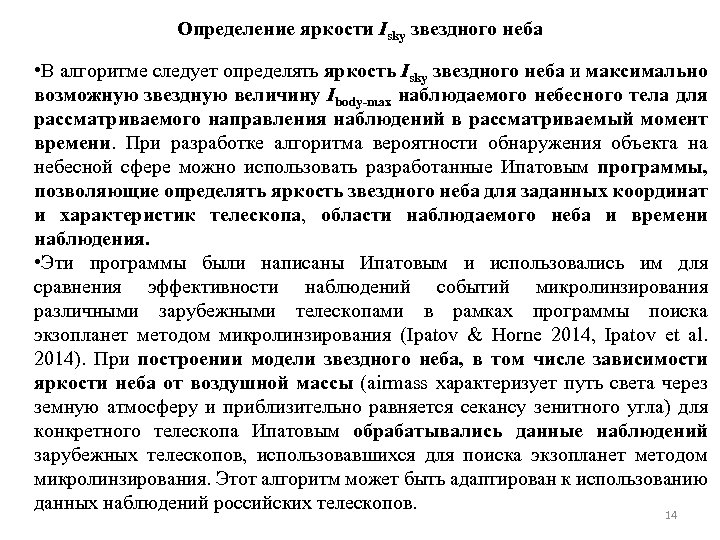 Определение яркости Isky звездного неба • В алгоритме следует определять яркость Isky звездного неба и максимально возможную звездную величину Ibody-max наблюдаемого небесного тела для рассматриваемого направления наблюдений в рассматриваемый момент времени. При разработке алгоритма вероятности обнаружения объекта на небесной сфере можно использовать разработанные Ипатовым программы, позволяющие определять яркость звездного неба для заданных координат и характеристик телескопа, области наблюдаемого неба и времени наблюдения. • Эти программы были написаны Ипатовым и использовались им для сравнения эффективности наблюдений событий микролинзирования различными зарубежными телескопами в рамках программы поиска экзопланет методом микролинзирования (Ipatov & Horne 2014, Ipatov et al. 2014). При построении модели звездного неба, в том числе зависимости яркости неба от воздушной массы (airmass характеризует путь света через земную атмосферу и приблизительно равняется секансу зенитного угла) для конкретного телескопа Ипатовым обрабатывались данные наблюдений зарубежных телескопов, использовавшихся для поиска экзопланет методом микролинзирования. Этот алгоритм может быть адаптирован к использованию данных наблюдений российских телескопов. 14