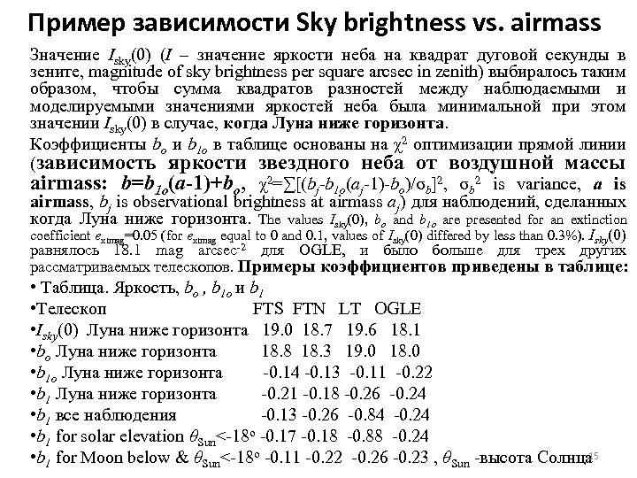 Пример зависимости Sky brightness vs. airmass Значение Isky(0) (I – значение яркости неба на квадрат дуговой секунды в зените, magnitude of sky brightness per square arcsec in zenith) выбиралось таким образом, чтобы сумма квадратов разностей между наблюдаемыми и моделируемыми значениями яркостей неба была минимальной при этом значении Isky(0) в случае, когда Луна ниже горизонта. Коэффициенты bo и b 1 o в таблице основаны на χ2 оптимизации прямой линии (зависимость яркости звездного неба от воздушной массы airmass: b=b 1 o(a-1)+bo, χ2=∑[(bj-b 1 o(aj-1)-bo)/σb]2, σb 2 is variance, a is airmass, bj is observational brightness at airmass aj) для наблюдений, сделанных когда Луна ниже горизонта. The values Isky(0), bo and b 1 o are presented for an extinction coefficient extmag=0. 05 (for extmag equal to 0 and 0. 1, values of Isky(0) differed by less than 0. 3%). Isky(0) равнялось 18. 1 mag arcsec-2 для OGLE, и было больше для трех других рассматриваемых телескопов. Примеры коэффициентов приведены в таблице: • Таблица. Яркость, bo , b 1 o и b 1 • Телескоп FTS FTN LT OGLE • Isky(0) Луна ниже горизонта 19. 0 18. 7 19. 6 18. 1 • bo Луна ниже горизонта 18. 8 18. 3 19. 0 18. 0 • b 1 o Луна ниже горизонта -0. 14 -0. 13 -0. 11 -0. 22 • b 1 Луна ниже горизонта -0. 21 -0. 18 -0. 26 -0. 24 • b 1 все наблюдения -0. 13 -0. 26 -0. 84 -0. 24 • b 1 for solar elevation θSun<-18 o -0. 17 -0. 18 -0. 88 -0. 24 15 • b 1 for Moon below & θSun<-18 o -0. 11 -0. 22 -0. 26 -0. 23 , θSun -высота Солнца