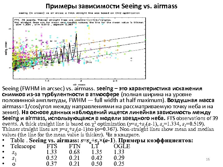 Примеры зависимости Seeing vs. airmass Seeing (FWHM in arcsec) vs. airmass. seeing – это характеристика искажения снимков из-за турбулентности в атмосфере (полная ширина на уровне половинной амплитуды, FWHM — full width at half maximum). Воздушная масса airmass=1/cos(угол между направлениями на рассматриваемую точку неба и на зенит). На основе данных наблюдений ищется линейная зависимость между Seeing и airmass, использующаяся в модели звездного неба. FTS observations of 39 events. A thick straight line is based on χ2 optimization (y=so+s 1(a-1), so=1. 334, s 1=0. 519). Thinner straight lines are y=so+s 1(a-1)±σ (σ=0. 367). Non-straight lines show mean and median values (the line for the mean value is thicker). Чи в квадрате. • • • Table. Seeing vs. airmass: s=so+s 1×(a-1). Примеры коэффициентов: Telescope FTS FTN LT OGLE s 0 1. 33 0. 68 1. 35 1. 33 s 1 0. 52 0. 21 0. 42 0. 29 σ 0. 37 0. 21 0. 50 0. 25 16